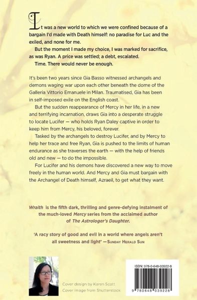 It was a new world to which we were confined because of a bargain I’d made with Death himself: no paradise for Luc and the exiled, and none for me. But the moment I made my choice, I was marked for sacrifice, as was Ryan. A price was settled; a debt, escalated. Time. There would never be enough. It’s been two years since Gia Basso witnessed archangels and demons waging war upon each other beneath the dome of the Galleria Vittorio Emanuele in Milan. Traumatised, Gia has been in self-imposed exile on the English coast. But the sudden reappearance of Mercy in her life, in a new and terrifying incarnation, draws Gia into a desperate struggle to locate Lucifer — who holds Ryan Daley captive in order to keep him from Mercy, his beloved, forever. Tasked by the archangels to destroy Lucifer, and by Mercy to help her trace and free Ryan, Gia is pushed to the limits of human endurance as she traverses the earth — with the help of friends old and new — to do the impossible. For Lucifer and his demons have discovered a new way to move freely in the human world. And Mercy and Gia must bargain with the Archangel of Death himself, Azraeil, to get what they want. Wraith is the fifth dark, thrilling and genre-defying instalment of the much-loved Mercy series from the acclaimed author of The Astrologer’s Daughter. ‘A racy story of good and evil in a world where angels aren’t all sweetness and light’ — Sunday Herald Sun