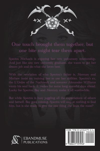 Spectra is a Balance, an Angelis, a Wraith. She has a price on her head, love in her heart, betrayal in her soul, and lust riding her body. Spectra Michaels is enjoying her new polyamory relationship with the sexy-as-sin Angelis Mercury Raphangelis and the gorgeous and deadly de Sang, Bay Ryder. And just like any new university graduate, she wants to get her dream job and do what she loves best. Unfortunately, with the revelation of who Spectra's father is, Mercury and Mathew insist on training her to use her abilities. Spectra's ex, the L'Ordre of the Nachtwelt and sorcerer Alexander Williams wants his soul back. It makes for some long stressful days ahead. Lucky for Spectra, Bay and Mercury make it all worthwhile. But while Spectra is busy juggling all the expectations of others and herself, Bay goes missing. Spectra will stop at nothing to find him, but is she ready to give the one thing she fears the most? One touch brought them together, but one bite might tear them apart.