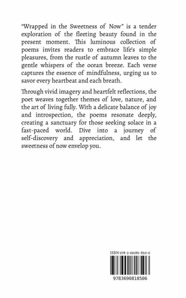 "Wrapped in the Sweetness of Now" is a tender exploration of the fleeting beauty found in the present moment. This luminous collection of poems invites readers to embrace life's simple pleasures, from the rustle of autumn leaves to the gentle whispers of the ocean breeze. Each verse captures the essence of mindfulness, urging us to savor every heartbeat and each breath. Through vivid imagery and heartfelt reflections, the poet weaves together themes of love, nature, and the art of living fully. With a delicate balance of joy and introspection, the poems resonate deeply, creating a sanctuary for those seeking solace in a fast-paced world. Dive into a journey of self-discovery and appreciation, and let the sweetness of now envelop you.