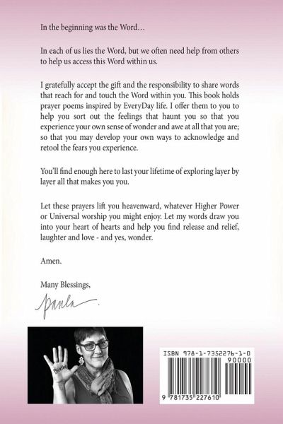 In this sea of overwhelm and confusion that is life, Paula's book provides soothing comfort. Whatever Higher Power you hold, these prayer poems lift your energy up, inspiring you to see your day-to-day emotions as guides, as wonders to behold rather than secrets to be kept. In this second edition, retitled, reformatted and including several previously unpublished prayer poems, Paula invites you to experience the more challenging moments of life as gifts--presents to embrace and learn from rather than lessons of shame and belittlement. Use this book to calm you before bed. Use it to begin your day with light. Use it midday to encourage you to pause and breathe and begin again. Know that all that you do to care for yourself this way helps you enjoy greater health of mind, body, and spirit. Feeling more peaceful helps you feel more resilient and therefore, better able to meet the challenges of the days and nights. Tapping into the calm deep within helps you BE the calm, the resilience, the peace you seek. Use this book in all the ways it calls you to honor yourself as you are, changing from moment to moment, day to day. Let it help you find YOUR voice in the cacophony of life. And let it help you feel and be at peace. Buy your copy. Write your prayers in the margins and then buy a copy for someone you love.