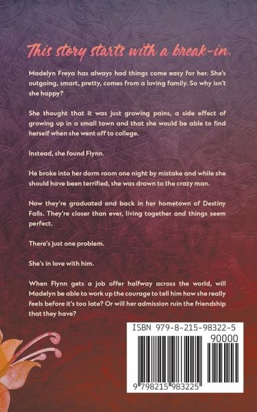 This story starts with a break-in. Madelyn Freya has always had things come easy for her. She's outgoing, smart, pretty, comes from a loving family. So why isn't she happy? She thought that it was just growing pains, a side effect of growing up in a small town and that she would be able to find herself when she went off to college. Instead, she found Flynn. He broke into her dorm room one night by mistake and while she should have been terrified, she was drawn to the crazy man. Now they're graduated and back in her hometown of Destiny Falls. They're closer than ever, living together and things seem perfect. There's just one problem. She's in love with him. When Flynn gets a job offer halfway across the world, will Madelyn be able to work up the courage to tell him how she really feels before it's too late? Or will her admission ruin the friendship that they have?