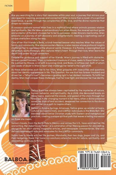 Are you searching for a story that resonates within your soul, a journey that mirrors your own quest for meaning, purpose, and connection? Wren is more than a novel-it's a spiritual experience, a guide through the complexities of life, love, and the divine mysteries that shape our existence. A common sparrow named Wren lives in a mythical land where animals possess wisdom and spirituality. Her life takes an extraordinary turn when Alnore, the revered spiritual guide and protector of the land, chooses her to be his successor. Under Alnore's mentorship, Wren embarks on a journey of self-discovery and enlightenment, meeting a captivating cast of unique characters along the way. One of her first friends is Betts, a kind-hearted beaver who teaches Wren the values of family and community. She also encounters Reinna, a wise macaw whose profound insights challenge her to see beyond the physical world. However, it is Fannie, a nearsighted and delightfully quirky flamingo, who captures Wren's heart. Through their love, Wren learns the depth and power of true connection. Despite the guidance and support of her friends, Wren's journey is filled with obstacles. Alnore's ancient nemesis, Styxn, a malevolent creature of chaos, seeks to thwart Wren's rise. He is joined by Mouse, a rat with a cunning mind, and Bubo, a ruthless owl, both of whom sow seeds of doubt in Wren's heart and challenge her belief in the Light of All. As these adversaries push her to her limits, Wren grapples with insecurities and questions about her identity and purpose in life. The Question, the one that has forever troubled and driven her -"What is true?"-becomes a guiding light in her darkest moments. To fulfill her destiny, Wren must conquer these challenges, trust her inner light, and discover her true identity.