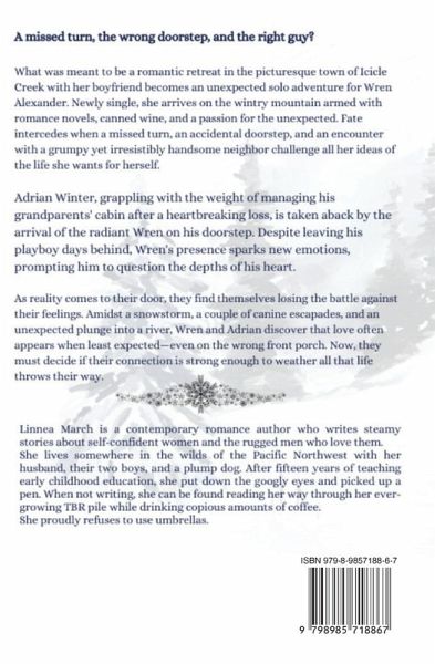 A missed turn, the wrong doorstep, and the right guy? What was meant to be a romantic retreat in the picturesque town of Icicle Creek with her boyfriend becomes an unexpected solo adventure for Wren Alexander. Newly single, she arrives on the wintry mountain armed with romance novels, canned wine, and a passion for the unexpected. Fate intercedes when a missed turn, an accidental doorstep, and an encounter with a grumpy yet irresistibly handsome neighbor challenges all her ideas of what this trip could be. Adrian Winter, grappling with the weight of managing his grandparents' cabin after a heartbreaking loss, is taken aback by the arrival of the radiant Wren on his doorstep. Despite leaving his playboy days behind, Wren's presence sparks a resurgence of emotions, prompting him to question the depths of his heart. As reality comes to their door, they find themselves losing the battle against their feelings. Amidst a snowstorm, a couple of canine escapades, and an unexpected plunge into a river, Wren and Adrian discover that love often appears when least expected-even on the wrong front porch. Now, they must decide if their connection is strong enough to weather all that life throws their way.