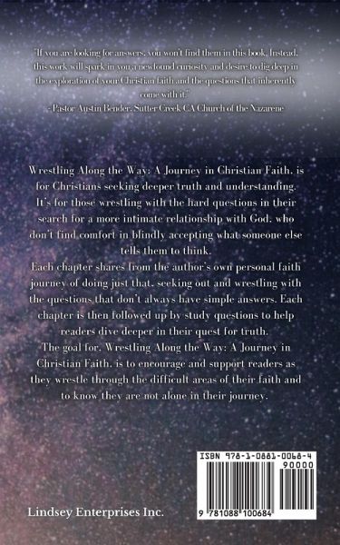 Wrestling Along the Way: A Journey in Christian Faith, is for Christians seeking deeper truth and understanding. It's for those wrestling with the hard questions in their search for a more intimate relationship with God, who don't find comfort in blindly accepting what someone else tells them to think. Each chapter shares from the author's own personal faith journey of doing just that, seeking out and wrestling with the questions that don't always have simple answers. Each chapter is then followed up by study questions to help readers dive deeper in their quest for truth. The goal for, Wrestling Along the Way: A Journey in Christian Faith, is to encourage and support readers as they wrestle through the difficult areas of their faith and to know they are not alone in their journey.