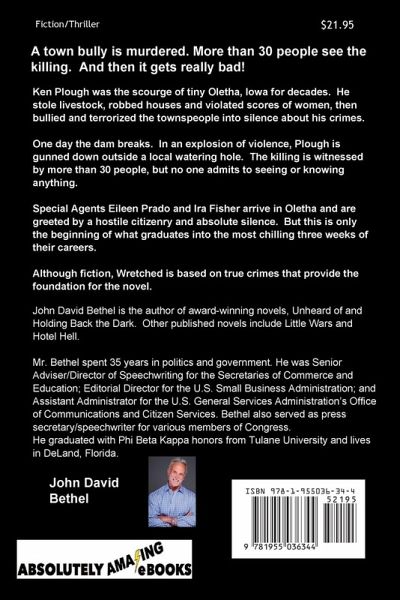 Ken Plough was the scourge of tiny Oletha, Iowa for decades. He stole livestock, robbed homes and violated young women. He avoided the consequences of his actions by bullying and terrorizing the townspeople with threats against them, their families and homes, burning a house to the ground in one instance, and critically wounding a neighbor in another. In an explosion of violence, Plough is gunned down as he sits in his truck outside a local watering hole; witnessed by more than 30 people who surrounded the truck where Plough sat with his wife. None of the witnesses would admit to seeing the shooter or knowing anything about the event. Plough's wife enlists the FBI to investigate the matter claiming the community and local law enforcement are acting "under the color of law" to deny her late husband justice, thereby "willfully depriving or conspiring to deprive him of a right protected by the Constitution." At the request of the regional U.S. Attorney, Special Agents Eileen Prado and Ira Fisher arrive in Oletha to investigate and are greeted by a hostile citizenry and absolute silence. But this is only the beginning of what graduates into the most chilling three weeks of their careers. Although fiction, Wretched is based on two true crimes that provide the foundation for the novel. The author also mines information and detail from FBI sources as well as psychological studies and literature on the subject of serial offenders creating a dark world the reader will fully and believably inhabit.