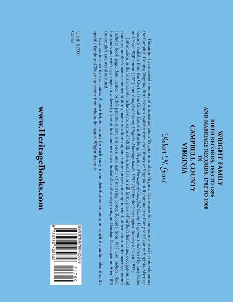 The author has amassed a bounty of information about Wrights in southern Virginia. The sources for the records listed in this volume are the Campbell County, Virginia, Birth Records available from the Library of Virginia in Richmond; the Campbell County, Virginia, Marriage Records available from the Clerk of the Circuit Court in Rustburg, Virginia; Marriages of Campbell County, Virginia 1782-1810 by Lucy Baber and Hazel Williamson (1971); and Campbell County, Virginia, Marriage Bonds 1781-1854 by the Genealogical Society of Utah (1937). Information in the birth records includes date, name of child, color, sex, live or still birth, place of birth, father's name, occupation, and residence, mother's name, number of births, name of informant, and informant's relationship to child. Information in the marriage records includes book page, date, names, bride's parents, surety, witnesses, and name of marrying pastor. Records from 1857 also include place, husband's and wife's age, single or widowed, places of birth and residence, husband's and wife's parents, and husband's occupation. After 1873 the couple's race was also noted. Each section has its own index. A most helpful feature for each entry is the identification column, in which the author identifies the specific family and Wright ancestors from whom the named Wright descends.