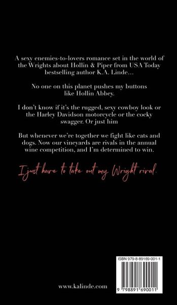 A sexy enemies-to-lovers romance set in the world of the Wrights about Hollin & Piper from USA Today bestselling author K.A. Linde... No one on this planet pushes my buttons like Hollin Abbey. I don't know if it's the rugged, sexy cowboy look or the Harley Davidson motorcycle or the cocky swagger. Or just him. But whenever we're together we fight like cats and dogs. Now our vineyards are rivals in the annual wine competition, and I'm determined to win. I just have to take out my Wright rival.