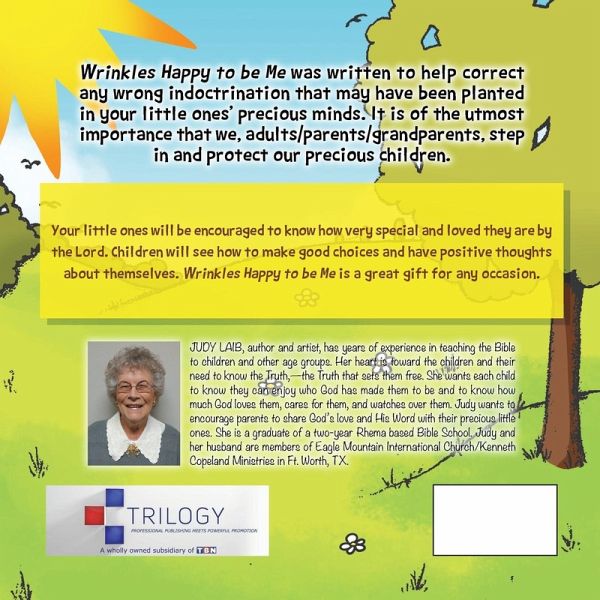 Wrinkles Happy to be Me was written to help correct any wrong indoctrination that may have been planted in your little ones' precious minds. It is of the utmost importance that we, adults/parents/grandparents, step in and protect our precious children. Your little ones will be encouraged to know how very special and loved they are by the Lord. Children will see how to make good choices and have positive thoughts about themselves. Wrinkles Happy to be Me is a great gift for any occassion.