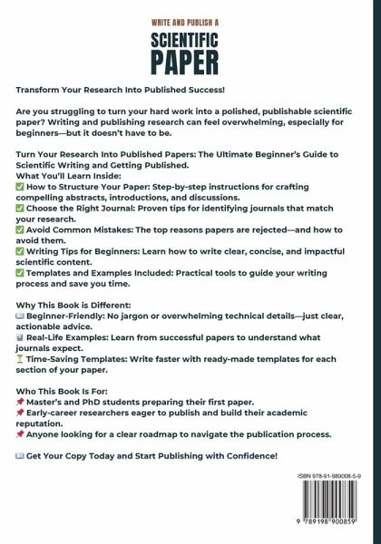 Transform Your Research Into Published Success! Are you struggling to turn your hard work into a polished, publishable scientific paper? Writing and publishing research can feel overwhelming, especially for beginners-but it doesn't have to be. Turn Your Research Into Published Papers: The Ultimate Beginner's Guide to Scientific Writing and Getting Published. What You'll Learn Inside: ¿ How to Structure Your Paper: Step-by-step instructions for crafting compelling abstracts, introductions, and discussions. ¿ Choose the Right Journal: Proven tips for identifying journals that match your research. ¿ Avoid Common Mistakes: The top reasons papers are rejected-and how to avoid them. ¿ Writing Tips for Beginners: Learn how to write clear, concise, and impactful scientific content. ¿ Templates and Examples Included: Practical tools to guide your writing process and save you time. Why This Book is Different: ¿¿¿¿ Beginner-Friendly: No jargon or overwhelming technical details-just clear, actionable advice. Get Your Copy Today and Start Publishing with Confidence!