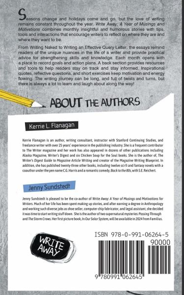 Write Away: A Year of Musings and Motivations is an essential companion for writers on their year-long creative journey. Immerse yourself in an engaging blend of monthly stories, inspirational insights, practical guidance, and expert tips designed to ignite your writing passion and hone your craft. From witty stories to indispensable advice, this book invites writers to not only reflect on their writing aspirations but also to take actionable steps towards achieving them. With dedicated sections to set goals, access valuable resources, and stay motivated, "Write Away" empowers you to transform your writing dreams into reality, one month at a time. Unleash your inner author and let "Write Away" be your steadfast guide to becoming the writer you've always aspired to be. "'Write Away promises to be a quintessential writer's tool, proving to be useful, month after month, for years to come.It has something useful for every writer, from the novice in the coffee shop, to the published guru sporting his or her own section at Barnes and Noble." "Sage, supportive, and often very funny, the short essays step the reader through a year of reflection and inspiration, sweetening the goals and challenges of the writing profession with vignettes drawn from the fabric of daily life.The beauty of the book lies in this ability to inspire through the everyday." Add Write Away to your cart so you can begin creating the writing life you always dreamed of.