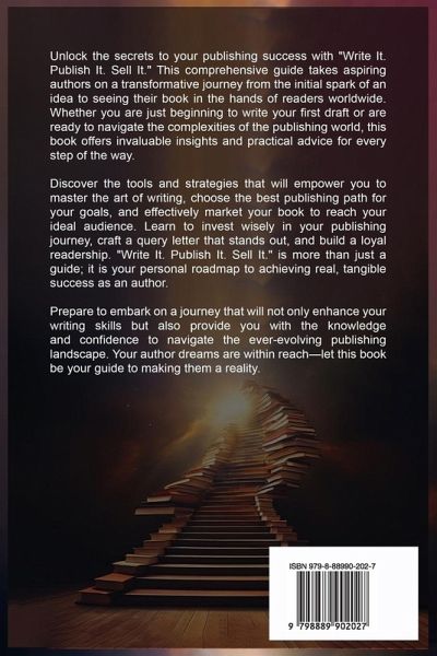Unlock the secrets to your publishing success with "Write It. Publish It. Sell It." This comprehensive guide takes aspiring authors on a transformative journey from the initial spark of an idea to seeing their book in the hands of readers worldwide. Whether you are just beginning to write your first draft or are ready to navigate the complexities of the publishing world, this book offers invaluable insights and practical advice for every step of the way. Discover the tools and strategies that will empower you to master the art of writing, choose the best publishing path for your goals, and effectively market your book to reach your ideal audience. Learn to invest wisely in your publishing journey, craft a query letter that stands out, and build a loyal readership. "Write It. Publish It. Sell It." is more than just a guide; it is your personal roadmap to achieving real, tangible success as an author. Prepare to embark on a journey that will not only enhance your writing skills but also provide you with the knowledge and confidence to navigate the ever-evolving publishing landscape. Your author dreams are within reach-let this book be your guide to making them a reality.