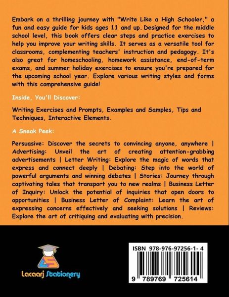 Get ready for an awesome adventure with "Write Like a High Schooler," a fun and easy guide for middle school kids aged 11 and up. This book is designed to guide you step-by-step through various writing topics, making it easy and fun to learn. Each chapter focuses on a different aspect of writing, including persuasive writing, fiction and non-fiction narrative, reviews, advertisements, business letters, friendly letters, debates, poetry, invitations, figurative language, and sensory story writing. With clear instructions and plenty of exercises to practice your new skills, this versatile tool is perfect for classrooms, complementing teachers' instruction and pedagogy. It's also a great resource for homeschooling parents. By the end of the book, your child will be able to think critically, brainstorm ideas, follow instructions, and practice effective writing habits with confidence. Get ready to explore different writing styles and forms, and watch your child's skills grow with each page!