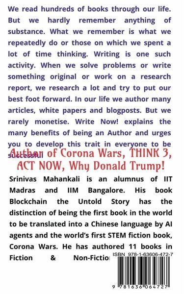 We read hundreds of books through our life. But we hardly remember anything of substance. What we remember is what we repeatedly do or those on which we spent a lot of time thinking. Writing is one such activity. When we solve problems or write something original or work on a research report, we research a lot and try to put our best foot forward. In our life we author many articles, white papers and blogposts. But we rarely monetise. Write Now! explains the many benefits of being an Author and urges you to develop this trait in everyone to be successful. The book discusses the various options to publish a book and the career options for writers.