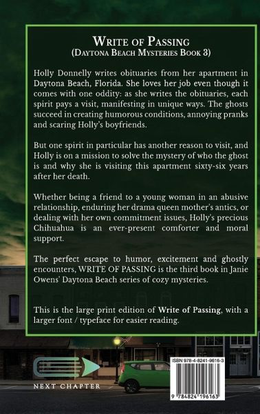 Holly Donnelly writes obituaries from her apartment in Daytona Beach, Florida. She loves her job even though it comes with one oddity: as she writes the obituaries, each spirit pays a visit, manifesting in unique ways. The ghosts succeed in creating humorous conditions, annoying pranks and scaring Holly's boyfriends. But one spirit in particular has another reason to visit, and Holly is on a mission to solve the mystery of who the ghost is and why she is visiting this apartment sixty-six years after her death. Whether being a friend to a young woman in an abusive relationship, enduring her drama queen mother's antics, or dealing with her own commitment issues, Holly's precious Chihuahua is an ever-present comforter and moral support. The perfect escape to humor, excitement and ghostly encounters, WRITE OF PASSING is the third book in Janie Owens' Daytona Beach series of cozy mysteries. This is the large print edition of Write of Passing, with a larger font / typeface for easier reading.