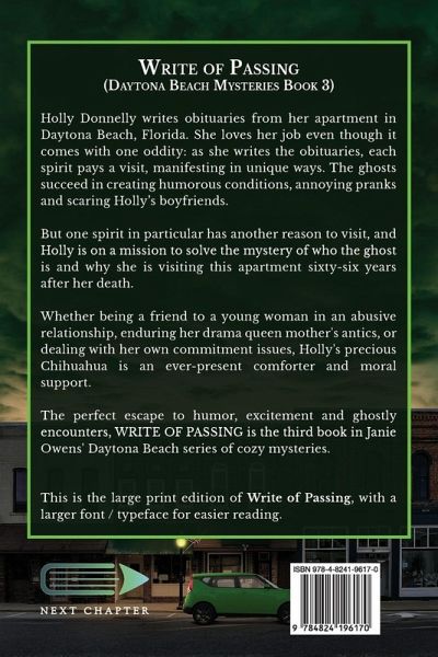 Holly Donnelly writes obituaries from her apartment in Daytona Beach, Florida. She loves her job even though it comes with one oddity: as she writes the obituaries, each spirit pays a visit, manifesting in unique ways. The ghosts succeed in creating humorous conditions, annoying pranks and scaring Holly's boyfriends. But one spirit in particular has another reason to visit, and Holly is on a mission to solve the mystery of who the ghost is and why she is visiting this apartment sixty-six years after her death. Whether being a friend to a young woman in an abusive relationship, enduring her drama queen mother's antics, or dealing with her own commitment issues, Holly's precious Chihuahua is an ever-present comforter and moral support. The perfect escape to humor, excitement and ghostly encounters, WRITE OF PASSING is the third book in Janie Owens' Daytona Beach series of cozy mysteries. This is the large print edition of Write of Passing, with a larger font / typeface for easier reading.
