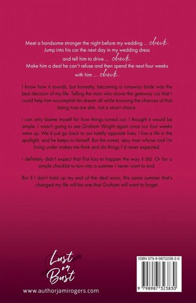 Meet a handsome stranger the night before my wedding ... check. Jump into his car the next day in my wedding dress and tell him to drive ... check. Make him a deal he can't refuse and then spend the next four weeks with him ... check. I know how it sounds, but honestly, becoming a runaway bride was the best decision of my life. Telling the man who drove the getaway car that I could help him accomplish his dream all while knowing the chances of that being true are slim, not a smart choice. I can only blame myself for how things turned out. I thought it would be simple. I wasn't going to see Graham Wright again once our four weeks were up. We'd just go back to our totally opposite lives. I live a life in the spotlight, and he keeps to himself. But the sweet, sexy man whose roof I'm living under makes me think and do things I'd never expected. I definitely didn't expect that first kiss to happen the way it did. Or for a simple checklist to turn into a summer I never want to end. But if I don't hold up my end of the deal soon, this same summer that's changed my life will be one that Graham will want to forget.