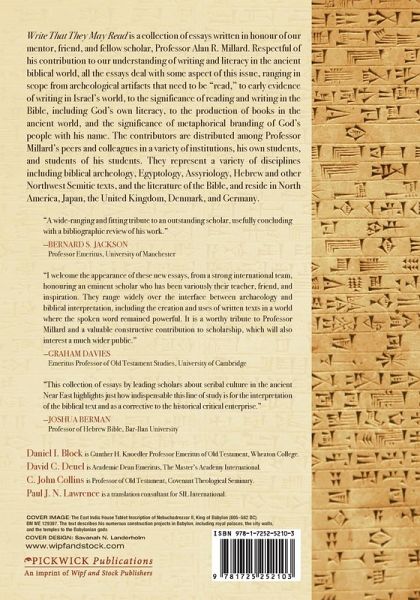 Write That They May Read is a collection of essays written in honor of our mentor, friend, and fellow scholar, Professor Alan R. Millard. Respectful of his contribution to our understanding of writing and literacy in the ancient biblical world, all the essays deal with some aspect of this issue, ranging in scope from archeological artifacts that need to be ""read,"" to early evidence of writing in Israel's world, to the significance of reading and writing in the Bible, including God's own literacy, to the production of books in the ancient world, and the significance of metaphorical branding of God's people with his name. The contributors are distributed among Professor Millard's peers and colleagues in a variety of institutions, his own students, and students of his students. They represent a variety of disciplines including biblical archeology, Egyptology, Assyriology, Hebrew and other Northwest Semitic texts, and the literature of the Bible, and reside in North America, Japan, the United Kingdom, Denmark, and Germany. Write That They May Read contains contributions by: Section 1: Artifacts and Minimalist Literacy 1. ""See That You May Understand"": Artifact Literacy--The Twin-cup Libation Vessels from Khirbet Qeiyafa Gerald Klingbeil, Research Professor of Old Testament and Ancient Near Eastern Studies, Andrews University Martin Klingbeil, Professor of Biblical Studies and Archaeology, and Associate Director, Institute of Archaeology Southern Adventist University 2. Ketiv-Qere: The Writing and Reading of EA 256 and Its Place in Reflecting the Realia of Power and Polity in the LBA-IA Golan and Peripheries Timothy M. Crow, Senior Lecturer in History, University of Akron; Professional Fellow Old Testament, Ashland Theological Seminary 3. Another Inscribed Arrowhead in the British Museum Terrence C. Mitchell¿. Former Keeper of Western Asiatic Antiquities, The British Museum, London, England 4. Earliest Literary Allusions to Homer and the Pentateuch from Ischia in Italy and Jerusalem Paul J. N. Lawrence, Translation Consultant, Summer Institute of Linguistics International 5. The Etymology of Hebrew lög and the Identity of Shavsha the Scribe Yoshiyuki Muchiki, Professor of Biblical Theology, Japan Bible Seminary, Tokyo Section 2: Artifacts and Official Literacy 6. The Writing/Reading of the Stone Tablet Covenant in the Light of the Writing/Reading/Hearing of the Silver Tablet Treaty Gordon Johnston, Professor of Old Testament, Dallas Theological Seminary 7. For Whose Eyes? The Divine Origins and Function of the Two Tablets of the Israelite Covenant Daniel I. Block, Gunther H. Knoedler Professor Emeritus of Old Testament, Wheaton College 8. Write That They May Judge? Applying Written Law in Biblical Israel Jonathan Burnside, Professor of Biblical Law, Law School, University of Bristol. 9. ""And Samuel Wrote in the Book"" (1 Samuel 10:25) and His Apology in First Samuel 1-15 Wolfgang Ertl, Dozent am Bibelseminar Bonn, Bornheim/Germany; Associate Professor of Old Testament, Southwestern Baptist Theological Seminary 10. ""For the one who will read it aloud will be able to run with it"" (Habakkuk 2:2c) David Toshio Tsumura, Professor of Old Testament, Japan Bible Seminar Section 3: The Rise of Literary Literacy 11. The History and Pre-History of the Hebrew Language in the West Semitic Literary Tradition Richard E. Averbeck, Professor of Old Testament and Semitic Languages, Trinity Evangelical Divinity School 12. Divine Action in the Hebrew Bible: ""Borrowing"" from Ancient Near Eastern Cultures and ""Inspiration"" C. John Collins, Professor of Old Testament, Covenant Theological Seminary 13. Encoding and Decoding Culture Jens Bruun Kofoed, Professor of Old Testament, Fjellhaug International University College, 14. No Books, No Authors: Literary Production in a Hearing-Dominant Culture John H. Walton, Professor of Old Testament, Wheaton College 15. The Discovery of the Book of the