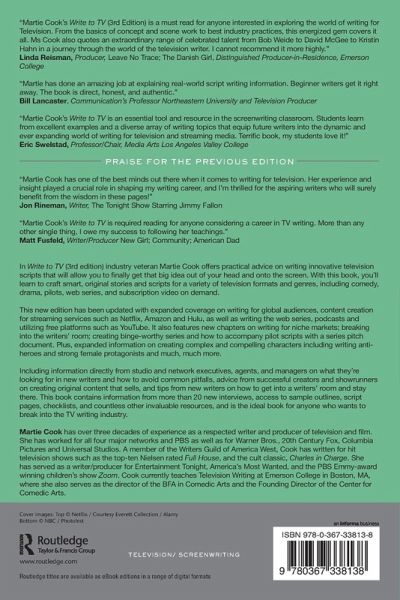 In Write to TV (third edition) industry veteran Martie Cook offers practical advice on writing innovative television scripts that will allow you to finally get that big idea out of your head and onto the screen. With this book you'll learn to craft smart, original stories and scripts for a variety of television formats and genres, including comedy, drama, pilots, web series, and subscription video on demand.