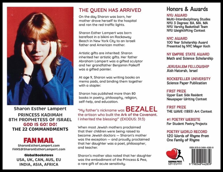 About the AuthorSEE THE WORLD THROUGH THE EYES OF A CREATIVE GENIUS: Sharon Esther Lampert has the #1 Poetry Website for Student Projects and Teacher Lesson Plans. NYC Mayor Edward Koch presented Sharon with the "100 Year Scholarship Award." NYU honored Sharon with a "Multi-Interdisciplinary Award." A secondary honor, Sharon Esther Lampert represented her class at her NYU Gallatin graduation. Sharon earned 3 NYU degrees. Sharon won an "Empire State Math and Science Scholarship Award." Sharon co-authored a scientific paper at Rockefeller University. Sharon won an "Aish Hatorah Jerusalem Fellowship Award." Sharonwon First Prize at the Upper East Side newspaper writing contest, NYC. Sharon won First Prize at the WAVE newspaper art contest. Her poetry has been published in thousands of online national and international poetry journals. On a global scale, Sharon Esther Lampert's poetry is used by students for their school projects. Teachers use Sharon Esther Lampert's poetry for their lesson plans. Sharon Esther Lampert's magnificent literary contributions to humanity encompass poetry, philosophy, prophecy, and education. Sharon Esther Lampert is also world famous for her ability to conceptualize philosophical ideas using one letter of the alphabet: THE AWESOME ART OF ALLITERATION USING ONE LETTER OF THE ALPHABET. In education, Sharon Esther Lampert pioneered the SMARTGRADES success strategy study skills. Her book, "The Silent Crisis Destroying America's Brightest Minds" was chosen as BOOK OF THE MONTH" by the Alma Public Library in Wisconsin If you are a seeker of truth and wisdom, Sharon Esther Lampert's books are packed to the brim with light. Expand your consciousness to a new dimension of spiritual transcendence.SEE THE WORLD THROUGH THE EYES OF A CREATIVE GENIUSSHARON ESTHER LAMPERTPopular Titles: Prodigy- Unleash the Creator, the God Within: 10 Esoteric Laws of Genius and CreativityProphet- Who Knew God Was Such a Chatterbox- 22 Commandments: A Universal Moral Compass for All People, for All Religions, and for All TimePhilosopherGod of What? 11 Esoteric Laws of InextricabilityPoet- I STOLE ALL THE WORDS FROM THE DICTIONARY- POETRY JEWELS: Diamonds, Rubies, Emeralds, Sapphires, and Pearls- VESSEL: Very. Extra. Special. Sharon. Esther. Lampert.- Immortality Is MinePioneer-. WIN AT THIN- SILLY LITTLE BOYS: 40 Rules of Manhood for Men of All Ages- SEX ON A PLATE: FOOD AS FOREPLAY: The Cookbook of Everlasting Love- LYMTY: Love You More Than Yesterday - 14 Relationship Strategies for Happily Ever After- YOUR WISH IS MY COMMANDMENT- Buried Alive in a Florida Condo: How Not to Wake-Up, Watch TV and Wait to DiePaladin of Education- SMARTGRADES BRAIN POWER REVOLUTION- THE SILENT CRISIS DESTROYING AMERICA'S BRIGHTEST MINDS- EVERY DAY AN EASY A- TOTAL RECALL: ACE EVERY TEST EVERY TIME- YOUR STUDY ROOM IS UNDER NEW MANAGEMENT-. Writers Run The World: 10 Secrets for Spinning Good Ideas into Great Ideas- SCHMALTZY, In America, Even A Cat Can Have A Dream (Ages 8-12)The Awesome Art of Alliteration Using One Letter of the Alphabet- CUPID: The Love Languages in Letter C- The Secret Sauce of Book Sales - Letter P- Temporary Insanity- Letter S- DESTINY - Letter D- POWER - Letter P- THERAPY - Letter T