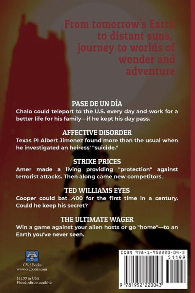 From tomorrow's Earth to distant suns, journey to worlds of wonder and adventure PASE DE UN DÍA Chalo could teleport to the U.S. every day and work for a better life for his family-if he kept his day pass. AFFECTIVE DISORDER Texas PI Albert Jimenez found more than the usual when he investigated an heiress' "suicide." STRIKE PRICES Amer made a living providing "protection" against terrorist attacks. Then along came new competitors. TED WILLIAMS EYES Cooper could bat .400 for the first time in a century. Could he keep his secret? THE ULTIMATE WAGER Win a game against your alien hosts or go "home"-to an Earth you've never seen.
