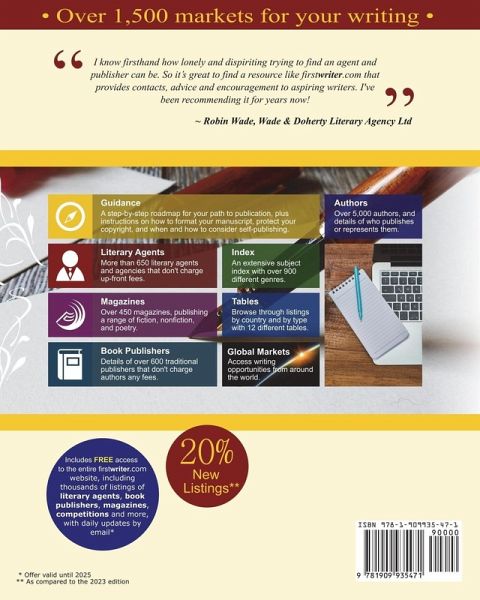 The 2024 edition of firstwriter.com's annual directory for writers is the perfect book for anyone searching for literary agents, book publishers, or magazines. It contains over 1,500 listings, including revised and updated listings from the 2023 edition, and 400 brand new entries. Finding the information you need is now quicker and easier than ever before, with multiple tables and a detailed index, and unique paragraph numbers to help you get to the listings you're looking for. The variety of tables helps you navigate the listings in different ways, and includes a Table of Authors, which lists over 5,000 authors and tells you who represents them, or who publishes them, or both. The number of genres in the index has expanded to over 900. So, for example, while there was only one option for "Romance" in previous editions, you can now narrow this down to Historical Romance, Fantasy Romance, Supernatural / Paranormal Romance, Contemporary Romance, Diverse Romance, Erotic Romance, Feminist Romance, Christian Romance, or even Amish Romance. The new edition includes: · Over 650 literary agents and agencies; · Over 450 magazines; and · Over 600 publishers that don't charge fees. International markets become more accessible than ever, with listings that cover both the main publishing centres of New York and London, as well as markets in other English speaking countries. With more and more agents, publishers, and magazines accepting submissions online, this international outlook is now more important than ever. There are no adverts, no advertorials, and no obscure listings padding out hundreds of pages. By including only what's important to writers - contact details for literary agents, publishers, and magazines - this directory is able to provide more listings than its competitors, at a lower price. The book also allows you to create a subscription to the firstwriter.com website for free until 2025. This means you can get free access to the firstwriter.com website, where you can find even more listings, and also benefit from other features such as advanced searches, daily email updates, feedback from users about the markets featured, saved searches, competitions listings, searchable personal notes, and more. "I know firsthand how lonely and dispiriting trying to find an agent and publisher can be. So it's great to find a resource like firstwriter.com that provides contacts, advice and encouragement to aspiring writers. I've been recommending it for years now!"~ Robin Wade; literary agent at the Wade & Doherty Literary Agency Ltd, and long-term firstwriter.com subscriber