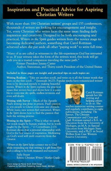 With more than 184 Christian writer's groups and 155 conferences, thousands of writers are looking for encouragement and insight. Yet, every Christian who writes faces the same issue: finding daily inspiration and creativity. Designed to be both encouraging and practical, "Writers in the Spirit" guides writers from the novice stage to becoming dedicated authors, something that Carol Rottman achieved when she put aside all other "paying work" to write full time. Included in these pages are insight and practical tips on such topics as: Writing Realism:"Take yet another scroll, and write on it all the former words that were on the first scroll ..." (Jeremiah 36:27). Popular media have romanticized writers' lives to be devoted entirely to making beautiful stories. Writers in the Spirit explains the practical issues that writers face and shows how it is possible to overcome dry spells, endless revisions and even self-doubt. Writing with Fervor:Much of the Apostle Paul's writing was done in prison. Paul's passion to win people to Christ overcame any obstacle. While many new writers feel restrained, Writers in the Spirit shows how to find the passion that fuels the writing process. Writing in the Spirit:"This is what we speak, not words taught by human wisdom, but in words taught by the Spirit ..." (1 Corinthians 2:13). Rottman shows that a personal relationship with God is the best source of inspiration. Mediating on God's word will yield creativity from the Creator. "Many of us are called as witnesses to the life-experiences God has entrusted to us. If your witness takes the form of the written word, this book will go with you as a trusted companion traveling the same path." - Former President Jimmy CarterAuthor, Statesman, and Thirty-ninth President of the United States "'Writers in the Spirit' helps connect me to God while reminding me that writing is a gift from Him and a calling to be both treasured and nurtured."- Sally Stuart, Editor, Christian Writers' Market Guide