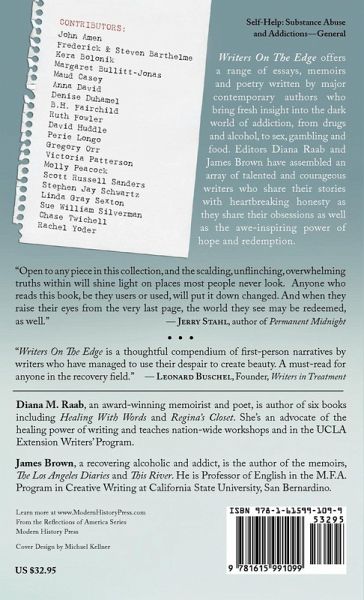 Writers On The Edge offers a range of essays, memoirs and poetry written by major contemporary authors who bring fresh insight into the dark world of addiction, from drugs and alcohol, to sex, gambling and food. Editors Diana M. Raab and James Brown have assembled an array of talented and courageous writers who share their stories with heartbreaking honesty as they share their obsessions as well as the awe-inspiring power of hope and redemption. "Open to any piece in this collection, and the scalding, unflinching, overwhelming truths within will shine light on places most people never look. Anyone who reads this book, be they users or used, will put it down changed. And when they raise their eyes from the very last page, the world they see may be redeemed, as well." --Jerry Stahl, author of Permanent Midnight CONTRIBUTORS: Frederick & Steven Barthelme, Kera Bolonik, Margaret Bullitt-Jonas, Maud Casey, Anna David, Denise Duhamel, B.H. Fairchild, Ruth Fowler, David Huddle Perie Longo, Gregory Orr, Victoria Patterson, Molly Peacock, Scott Russell Sanders, Stephen Jay Schwartz, Linda Gray Sexton, Sue William Silverman, Chase Twichell, and Rachel Yoder About the Editors Diana M. Raab, an award-winning memoirist and poet, is author of six books including Healing With Words and Regina's Closet. She's an advocate of the healing power of writing and teaches nation-wide workshops and in the UCLA Extension Writers' Program. James Brown, a recovering alcoholic and addict, is the author of the memoirs, The Los Angeles Diaries and This River. He is Professor of English in the MFA Program in Creative Writing at California State University, San Bernardino. From the Reflections of America Series Modern History Press www.ModernHistoryPress.com SEL006000 Self-Help : Substance Abuse & Addictions - Alcoholism SEL003000 Self-Help : Adult Children of Alcoholics PSY038000 Psychology : Psychopathology - Addiction