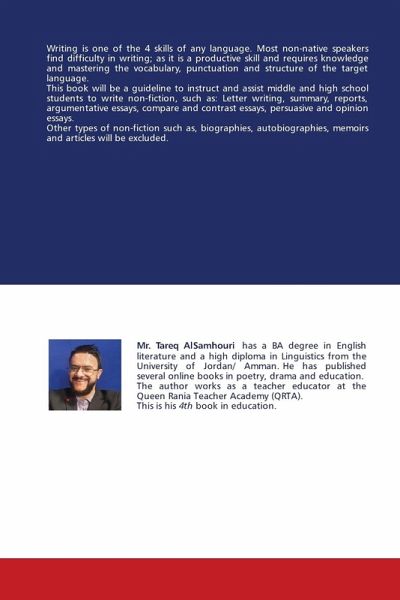 Writing is one of the 4 skills of any language. Most non-native speakers find difficulty in writing; as it is a productive skill and requires knowledge and mastering the vocabulary, punctuation and structure of the target language.This book will be a guideline to instruct and assist middle and high school students to write non-fiction, such as: Letter writing, summary, reports, argumentative essays, compare and contrast essays, persuasive and opinion essays.Other types of non-fiction such as, biographies, autobiographies, memoirs and articles will be excluded.