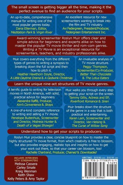 Award-winning screenwriter and author Roslyn Muir offers clear and simple advice for beginners and experts alike on how to master the popular TV movie genre with a focus on the thriller and rom-com. Writing a TV Movie is an exceptional resource for screenwriters, instructors, and industry professionals. Learn the unique 9-act structure of the TV movie used by Hallmark, Lifetime, Netflix, and others. Understand how to write the script, get it to producers, and start your screenwriting career. Bonus content includes interviews and writing tips from produced TV movie screenwriters: Melissa Cassera, Carley Smale, Kraig Wenman, Keith Shaw, Kelly Peters, and Amy Taylor.