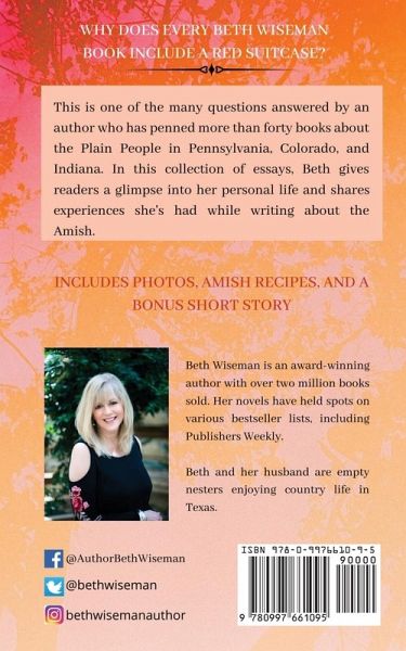 Why does every Beth Wiseman book include a red suitcase? This is one of the questions answered by an author who has penned more than forty books about the Plain People in Pennsylvania, Colorado, & Indiana. In this collection of essays, Beth gives readers a glimpse into her personal life & shares experiences she's had while writing about the Amish.