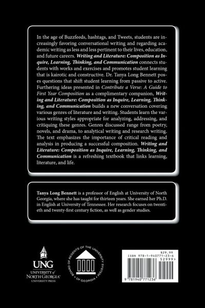 In the age of Buzzfeeds, hashtags, and Tweets, students are increasingly favoring conversational writing and regarding academic writing as less pertinent in their personal lives, education, and future careers. Writing and Literature: Composition as Inquiry, Learning, Thinking and Communication connects students with works and exercises and promotes student learning that is kairotic and constructive. Dr. Tanya Long Bennett, professor of English at the University of North Georgia, poses questions that encourage active rather than passive learning. Furthering ideas presented in Contribute a Verse: A Guide to First Year Composition as a complimentary companion, Writing and Literature builds a new conversation covering various genres of literature and writing. Students learn the various writing styles appropriate for analyzing, addressing, and critiquing these genres including poetry, novels, dramas, and research writing. The text and its pairing of helpful visual aids throughout emphasizes the importance of critical reading and analysis in producing a successful composition. Writing and Literature is a refreshing textbook that links learning, literature, and life.