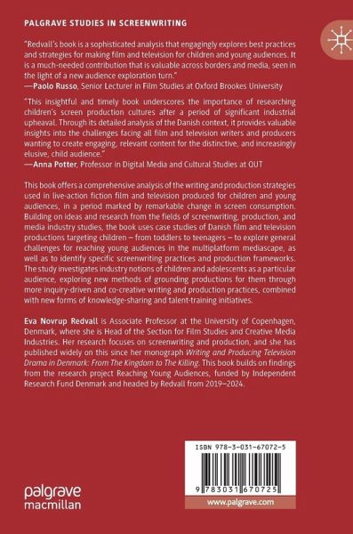 This book offers a comprehensive analysis of the writing and production strategies used in live-action fiction film and television produced for children and young audiences, in a period marked by remarkable change in screen consumption. Building on ideas and research from the fields of screenwriting, production, and media industry studies, the book uses case studies of Danish film and television productions targeting children - from toddlers to teenagers - to explore general challenges for reaching young audiences in the multiplatform mediascape, as well as to identify specific screenwriting practices and production frameworks. The study investigates industry notions of children and adolescents as a particular audience, exploring new methods of grounding productions for them through more inquiry-driven and co-creative writing and production practices, combined with new forms of knowledge-sharing and talent-training initiatives.