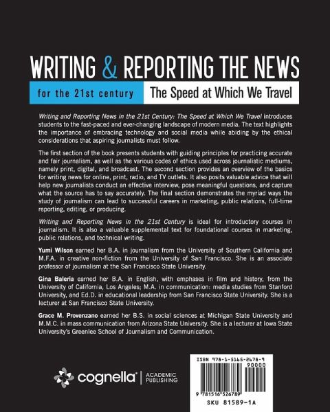 Writing and Reporting News in the 21st Century: The Speed at Which We Travel introduces students to the fast-paced and ever-changing landscape of modern media. The text highlights the importance of embracing technology and social media while abiding by the ethical considerations that aspiring journalists must follow. The first section of the book presents students with guiding principles for practicing accurate and fair journalism, as well as the various codes of ethics used across journalistic mediums, namely print, digital, and broadcast. The second section provides an overview of the basics for writing news for online, print, radio, and TV outlets. It also posits valuable advice that will help new journalists conduct an effective interview, pose meaningful questions, and capture what the source has to say accurately. The final section demonstrates the myriad ways the study of journalism can lead to successful careers in marketing, public relations, full-time reporting, editing, or producing. Writing and Reporting News in the 21st Century is ideal for introductory courses in journalism. It is also a valuable supplemental text for foundational courses in marketing, public relations, and technical writing. Yumi Wilson earned her B.A. in journalism from the University of Southern California and M.F.A. in creative non-fiction from the University of San Francisco. She is an associate professor of journalism at the San Francisco State University. Grace M. Provenzano earned her B.S. in social sciences at Michigan State University and M.M.C. in mass communication from Arizona State University. She is a lecturer at Iowa State University's Greenlee School of Journalism and Communication. Gina Baleria earned her B.A. in English, with emphases in film and history, from the University of California, Los Angeles; M.A. in communication: media studies from Stanford University, and Ed.D. in educational leadership from San Francisco State University. She is a lecturer at San Francisco State University.