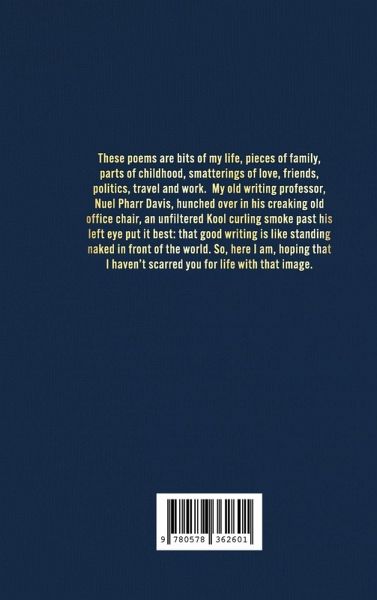 These poems are bits of my life, pieces of family, parts of childhood, smatterings of love, friends, politics, travel and work. My old writing professor, Nuel Pharr Davis, hunched over in his creaking old office chair, an unfiltered Kool curling smoke past his left eye put it best: that good writing is like standing naked in front of the world. So, here I am, hoping that I haven't scarred you for life with that image.
