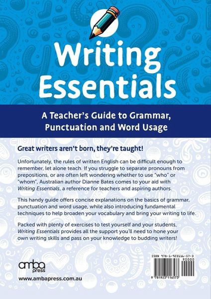 Unfortunately, the rules of written English can be difficult enough to remember, let alone teach. If you struggle to separate pronouns from prepositions, or are often left wondering whether to use "who" or "whom", Australian author Dianne Bates comes to your aid with Writing Essentials, a welcome reference for teachers and aspiring authors. This handy guide offers concise explanations on the basics of grammar, punctuation and word usage, while also introducing fundamental techniques to help broaden your vocabulary and bring your writing to life. Packed with plenty of exercises to test yourself and your students, Writing Essentials provides all the support you'll need to hone your own writing skills and pass on your knowledge to budding writers!