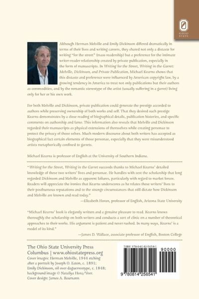 Although Herman Melville and Emily Dickinson differed dramatically in terms of their lives and writing careers, they shared not only a distaste for writing "for the street" (mass readership) but a preference for the intimate writer-reader relationship created by private publication, especially in the form of manuscripts. In Writing for the Street, Writing in the Garret: Melville, Dickinson, and Private Publication, Michael Kearns shows that this distaste and preference were influenced by American copyright law, by a growing tendency in America to treat not only publications but their authors as commodities, and by the romantic stereotype of the artist (usually suffering in a garret) living only for her or his own work. For both Melville and Dickinson, private publication could generate the prestige accorded to authors while preserving ownership of both works and self. That they desired such prestige Kearns demonstrates by a close reading of biographical details, publication histories, and specific comments on authorship and fame. This information also reveals that Melville and Dickinson regarded their manuscripts as physical extensions of themselves while creating personae to protect the privacy of those selves. Much modern discourse about both writers has accepted as biographical fact certain elements of those personae, especially that they were misunderstood artists metaphorically confined to garrets.