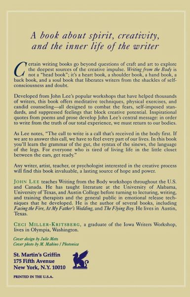 A book about spirit, creativity, and the inner life of the writer Certain writing books go beyond questions of craft and art to explore the deepest sources of the creative impulse. Writing from the Body is not a "head book"; it is a heart book, a shoulder book, a hand book, a back book, and a soul book that liberates writers from the shackles of self-consciousness and doubt. Developed from John Lee's popular workshops that have helped thousands of writers, this book offers meditative techniques, physical exercises, and candid counseling--all designed to combat the fears, self-imposed standards, and suppressed feelings that block creative potential. Inspirational qutoes from poems and prose develop John Lee's central message: in order to write from the truth of our total experience, we most return to our bodies. As Lee notes, "The call to write is a call that's received in the body first. If we are to answer this call, we have to feel every part of our lives. In this book you'll learn the grammar of the gut, the syntax of the sinews, the launage of the legs. For everyone who is tired of living life in the little closet between the ears, get ready." Any writer, artist, teacher, or psychologist interested in the creative process will find this book invaluable, a lasting source of hope and power.