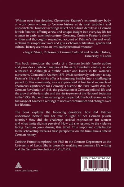 «Written over four decades, Clementine Krämer's extraordinary body of work bears witness to German history at its most turbulent and unpredictable. Krämer's writings reflect her hybrid identity as a German Jewish feminist, offering a new and unique insight into everyday life for women in early twentieth-century Germany. Corinne Painter's clearly written and thoroughly researched account of Krämer's life and work reclaims this important voice and gives scholars of literature, gender and cultural history access to an invaluable historical resource.» (Ingrid Sharp, Professor of German Cultural and Gender History, University of Leeds)