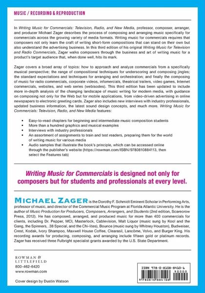 In Writing Music for Commercials: Television, Radio, and New Media, professor, composer, arranger, and producer Michael Zager describes the process of composing and arranging music specifically for commercials across the growing variety of media formats.