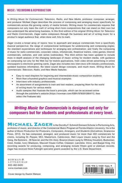 In Writing Music for Commercials: Television, Radio, and New Media, professor, composer, arranger, and producer Michael Zager describes the process of composing and arranging music specifically for commercials across the growing variety of media formats.