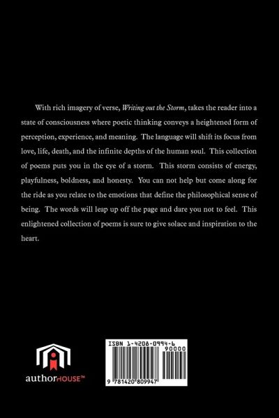 With rich imagery of verse, Writing Out the Storm, takes the reader into a state of consciousness where poetic thinking conveys a heightened form of perception, experience, and meaning. The language will shift its focus from love, life, death, and the infinite depths of the human soul. This collection of poems puts you in the eye of a storm. This storm consists of energy, playfulness, boldness, and honesty. You can not help but come along for the ride as you relate to the emotions that define the philosophical sense of being. The words will leap up off the page and dare you not to feel. This enlightened collection of poems is sure to give solace and inspiration to the heart.