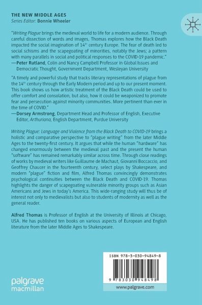 Writing Plague: Language and Violence from the Black Death to COVID-19 brings a holistic and comparative perspective to "plague writing" from the later Middle Ages to the twenty-first century. It argues that while the human "hardware" has changed enormously between the medieval past and the present (urbanization, technology, mass warfare, and advances in medical science), the human "software" (emotional and psychological reactions to the shock of pandemic) has remained remarkably similar across time. Through close readings of works by medieval writers like Guillaume de Machaut, Giovanni Boccaccio, and Geoffrey Chaucer in the fourteenth century, select plays by Shakespeare, and modern "plague" fiction and film, Alfred Thomas convincingly demonstrates psychological continuities between the Black Death and COVID-19. In showing how in times of plague human beings repress their fears and fantasies and displace them onto the threatening "other," Thomas highlights the danger of scapegoating vulnerable minority groups such as Asian Americans and Jews in today's America. This wide-ranging study will thus be of interest not only to medievalists but also to students of modernity as well as the general reader.