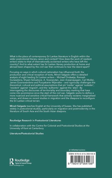 Focusing on ways in which cultural nationalism has influenced both the production and critical reception of texts, Salgado presents a detailed analysis of eight leading Sri Lankan writers - Michael Ondaatje, Romesh Gunasekera, Shyam Selvadurai, A. Sivanandan, Jean Arasanayagam, Carl Muller, James Goonewardene and Punyakante Wijenaike a " to rigorously challenge the theoretical, cultural and political assumptions that pit a insidera (TM) against a outsidera (TM), a residenta (TM) against a migranta (TM) and the a authentica (TM) against the a aliena (TM). By interrogating the discourses of territoriality and boundary marking that have come into prominence since the start of the civil war, Salgado works to define a more nuanced and sensitive critical framework that actively reclaims marginalized voices and draws upon recent studies in migration and the diaspora to reconfigure the Sri Lankan critical terrain.