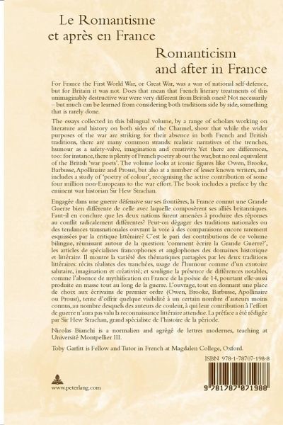The essays collected in this bilingual volume, by a range of scholars working on literature and history on both sides of the Channel, show that while the wider purposes of the war are striking for their absence in both French and British traditions, there are many common strands: realistic narratives of the trenches, humour as a safety-valve, imagination and creativity. Yet there are differences, too: for instance, there is plenty of French poetry about the war, but no real equivalent of the British «war poets». The volume looks at iconic figures like Owen, Brooke, Barbusse, Apollinaire and Proust, but also at a number of lesser known writers, and includes a study of «poetry of colour», recognising the active contribution of some four million non-Europeans to the war effort. The book includes a preface by the eminent war historian Sir Hew Strachan.