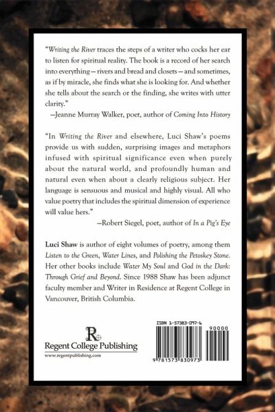 "Writing the River traces the steps of a writer who cocks her ear to listen for spiritual reality. The book is a record of her search into everything - rivers and bread and closets - and sometimes, as if by miracle, she finds what she is looking for. And whether she tells about the search or the finding, she writes with utter clarity." -Jeanne Murray Walker, poet, author of Coming Into History "In Writing the River and elsewhere, Luci Shaw's poems provide us with sudden, surprising images and metaphors infused with spiritual significance even when purely about the natural world, and profoundly human and natural even when about a clearly religious subject. Her language is sensuous and musical and highly visual. All who value poetry that includes the spiritual dimension of experience will value hers." -Robert Siegel, poet, author of In a Pig's Eye Luci Shaw is author of eight volumes of poetry, among them Listen to the Green, Water Lines, and Polishing the Petoskey Stone. Her other books include Water My Soul and God in the Dark: Through Grief and Beyond. Since 1988 Shaw has been adjunct faculty member and Writer in Residence at Regent College in Vancouver, British Columbia.