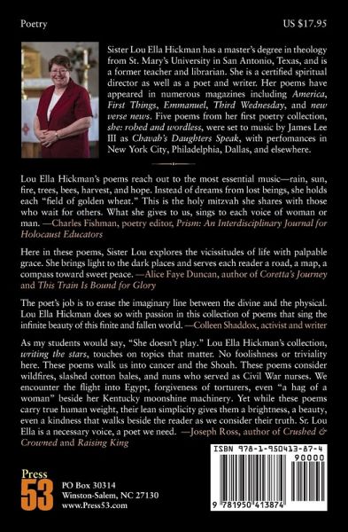 Lou Ella Hickman's collection, writing the stars, touches on topics that matter. No foolishness or triviality here. These poems walk us into cancer and the Shoah. These poems consider wildfires, slashed cotton bales, and nuns who served as Civil War nurses. We encounter the flight into Egypt, forgiveness of torturers, even "a hag of a woman" beside her Kentucky moonshine machinery. Yet while these poems carry true human weight, their lean simplicity gives them a brightness, a beauty, even a kindness that walks beside the reader as we consider their truth. Sr. Lou Ella is a necessary voice, a poet we need. (Joseph Ross)…mehr