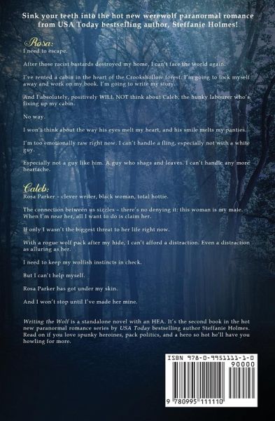Sink your teeth into the hot new werewolf paranormal romance from USA Todaybestselling author, Steffanie Holmes! Rosa: I need to escape. After those racist bastards destroyed my home, I can’t face the world again. I’ve rented a cabin in the heart of the Crookshollow forest. I’m going to lock myself away and work on my book. I’m going to write my story. And I absolutely, positively WILL NOT think about Caleb, the hunky labourer who’s fixing up my cabin. No way. I won’t think about the way his eyes melt my heart, and his smile melts my panties. I’m too emotionally raw right now. I can’t handle a fling, especially not with a white guy. Especially not a guy like him. A guy who shags and leaves. I can’t handle any more heartache. Caleb Rosa Parker – clever writer, black woman, total hottie. The connection between us sizzles – there’s no denying it: this woman is my mate. When I’m near her, all I want to do is claim her. If only I wasn’t the biggest threat to her life right now. With a rogue wolf pack after my hide, I can’t afford a distraction. Even a distraction as alluring as her. I need to keep my wolfish instincts in check. But I can’t help myself. Rosa Parker has got under my skin. And I won’t stop until I’ve made her mine. Writing the Wolf is a standalone novel with an HEA. It’s the second book in the hot new paranormal romance series by USA Today bestselling author Steffanie Holmes. Read on if you love spunky heroines, pack politics, and a hero so hot he’ll have you howling for more.