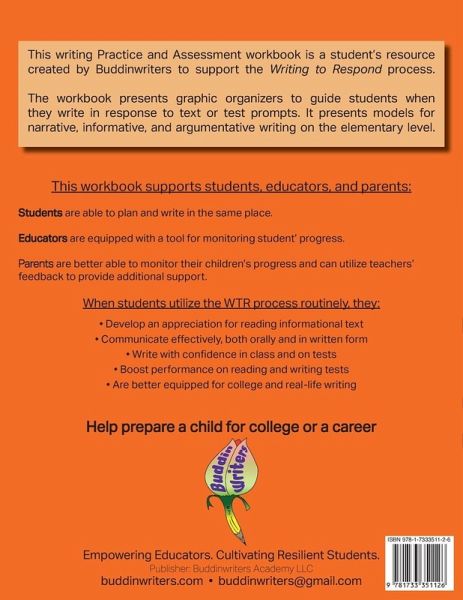 This writing Practice and Assessment workbook is a student’s resource created by Buddinwriters Academy to support the Writing to Respond process. It focuses on Cultivating Habits that Develop Critical Thinking • Problem Solving • Analytical Thinking . Research Skills and Evidence-Based writing across disciplines. The workbook presents graphic organizers to guide students when they write in response to text or test prompts. It presents models for narrative, informative, and argumentative writing on the elementary level. Parent or school educators utilize this as a tool for progress monitoring since students are able to write in the book. It also provides opportunities for writing across disciplines.