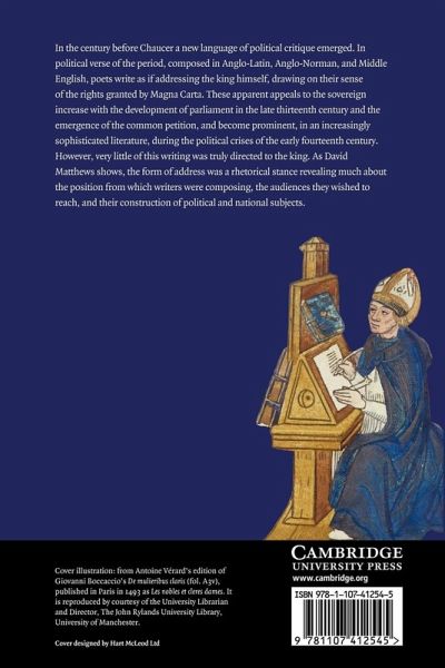 In the century before Chaucer a new language of political critique emerged. In political verse of the period, composed in Anglo-Latin, Anglo-Norman, and Middle English, poets write as if addressing the king himself, drawing on their sense of the rights granted by Magna Carta. These apparent appeals to the sovereign increase with the development of parliament in the late thirteenth century and the emergence of the common petition, and become prominent, in an increasingly sophisticated literature, during the political crises of the early fourteenth century. However, very little of this writing was truly directed to the king. As David Matthews shows in this book, the form of address was a rhetorical stance revealing much about the position from which writers were composing, the audiences they wished to reach, and their construction of political and national subjects.