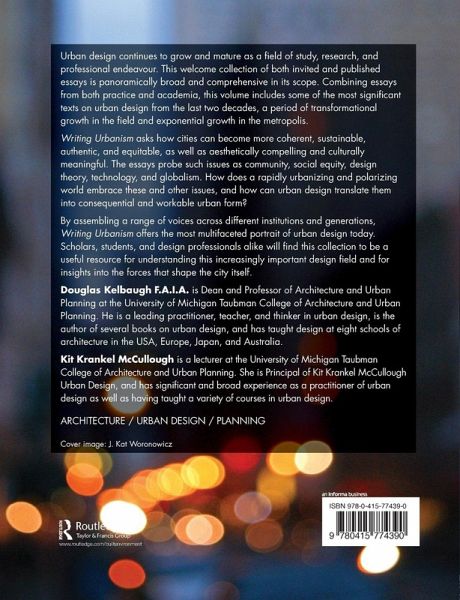 Douglas Kelbaugh F.A.I.A. is Dean and Professor of Architecture and Urban Planning at the University of Michigan Taubman College of Architecture and Urban Planning. He is a leading practitioner, teacher, and thinker in urban design, is the author of several books on urban design, and has taught design at eight schools of architecture in the USA, Europe, Japan, and Australia. Kit Krankel McCullough is a lecturer at the University of Michigan Taubman College of Architecture and Urban Planning. She is Principal of Kit Krankel McCullough Urban Design, and has significant and broad experience as a practitioner of urban design as well as having taught a variety of courses in urban design.